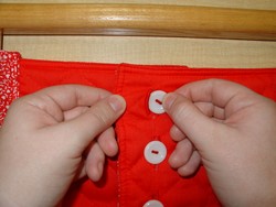2. Pinch the button in the right hand and pull the button-hole open with the left hand.