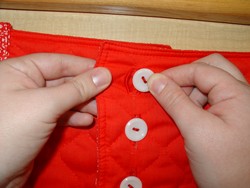 - Pull the button with the right hand and pull the button-hole open with the left to allow the button to pass through.