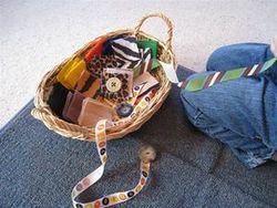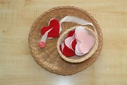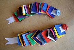 A fun variation on the button frame is a button snake or felt snake. You will need a ribbon with a button sewn at one end, and squares of felt with button holes cut to match the size of the button. The button is pushed through the hole in a felt square, and then you slide the square down the ribbon.