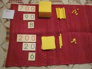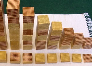 Hundred squares and thousand cubes take a long time to make and can be rather expensive, so when doing activities that use a lot of hundreds and thousands, wooden representations of hundreds and thousands are used in the place of the beaded kind.