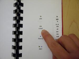 In this activity the child learns to use the Phonogram Dictionary. This is a reference booklet that allows the child to look up unfamiliar phonograms (graphemes) in words while reading.